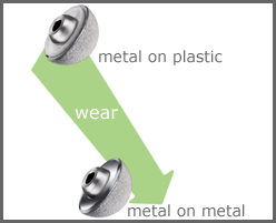In this case, both the ball and socket are made from tough, smooth cobalt chrome metal. Traditionally, only the ball is made from cobalt chrome, and the socket is lined with a plastic cup. While this plastic cup has some design advantages, it does wear out over the course of many years since it rubs against the metal ball at a rate of nearly two million footsteps per year in physically active adults.